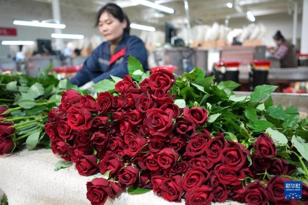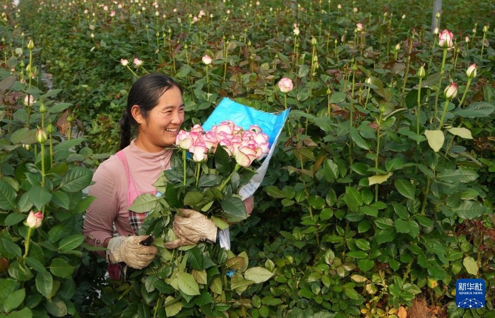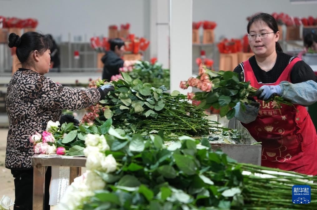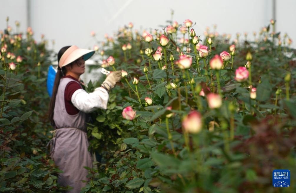 r早春时节,山东省新泰市楼德镇大棚玫瑰种植园的工作人员忙着采摘、加工、装运玫瑰鲜切花,供应各地市场。近年来,新泰市楼德镇大力发展大棚玫瑰种植产业,目前可年产玫瑰鲜切花1亿多枝,吸纳当地村民就业600余人。